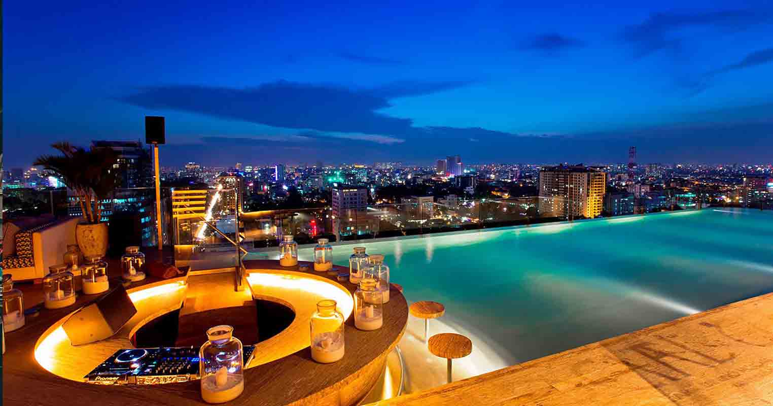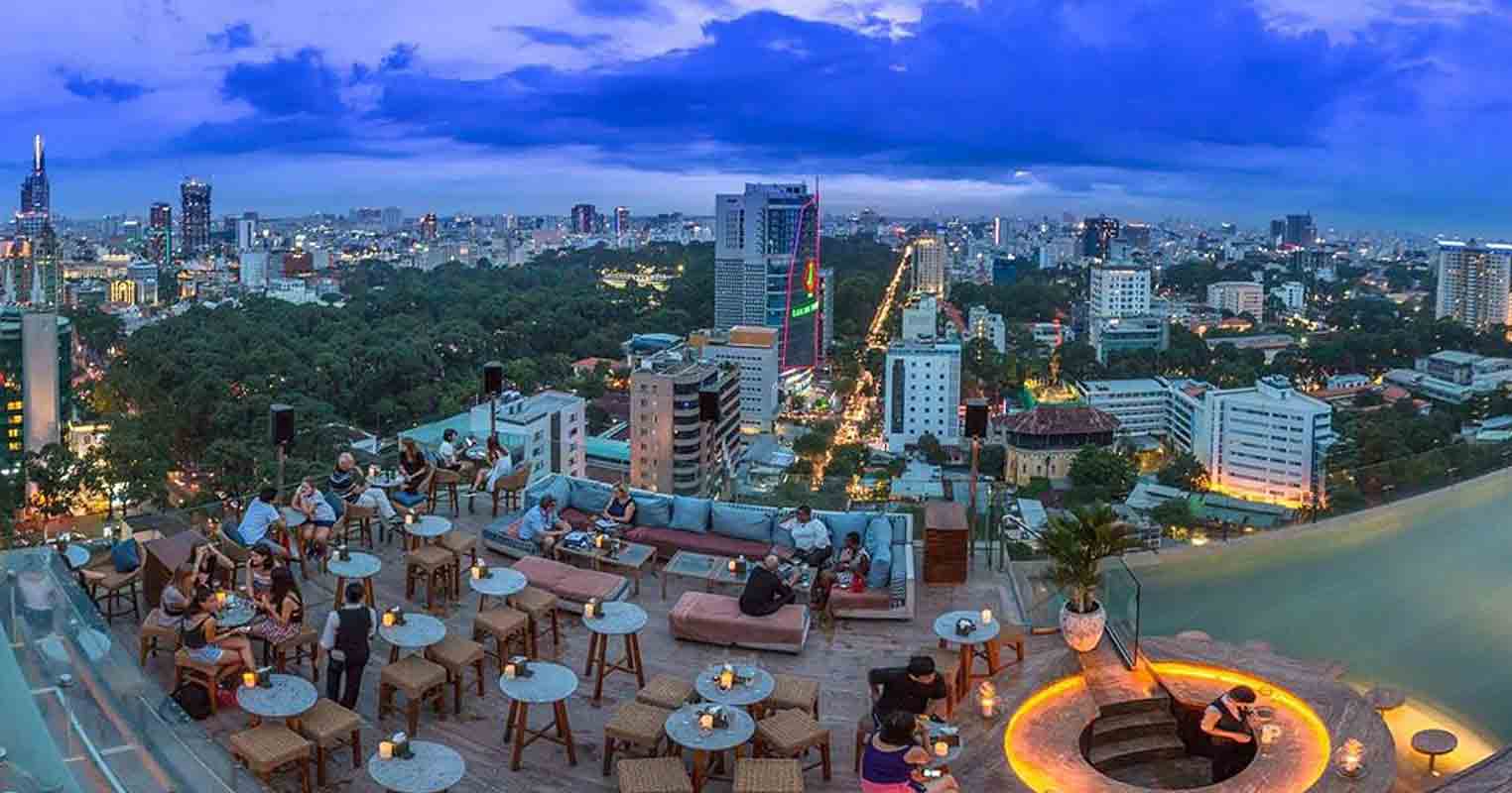 Secluded far in the right side is the highest rooftop infinity pool in the city. The water looks irresistibly attractive in a calm afternoon. Our pool just awaits you and invites you to dive in as the sun is out and the sky is infinite. Impressed yet is the first and only glass suspension bridge up in the middle of the air in Ho Chi Minh City, connecting between the hotel and Centec Tower. Besides being a classy restaurant, it is a stylish rooftop bar with lounge areas and a swimming pool. The swimming pool overhangs the edge of the building and includes a pool bar. The venue was designed by the famous designer of Super Potato, and therefore has a unique, luxurious atmosphere.